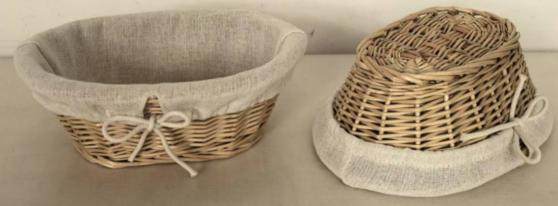 Cette corbeille à pain ovale en osier et tissu est l'accessoire décoratif et indispensable pour un service de table soigné.