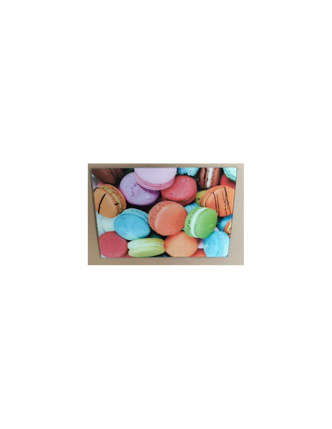 Optimisez vos préparations tout en décorant votre cuisine avec cette Planche à Découper en Verre "Macaron". Pratique et hygiénique, cette planche multifonctionnelle offre une surface de coupe durable et résistante à la chaleur, tout en affichant un motif gourmand de macarons.