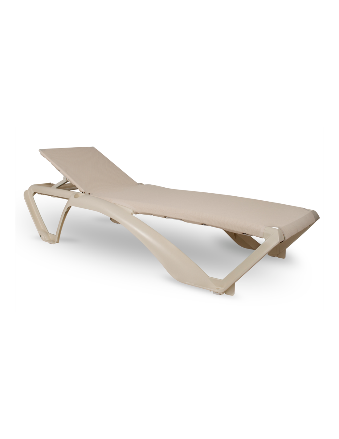 Chaise longue empilable avec structure en polypropylène et fibre de verre.