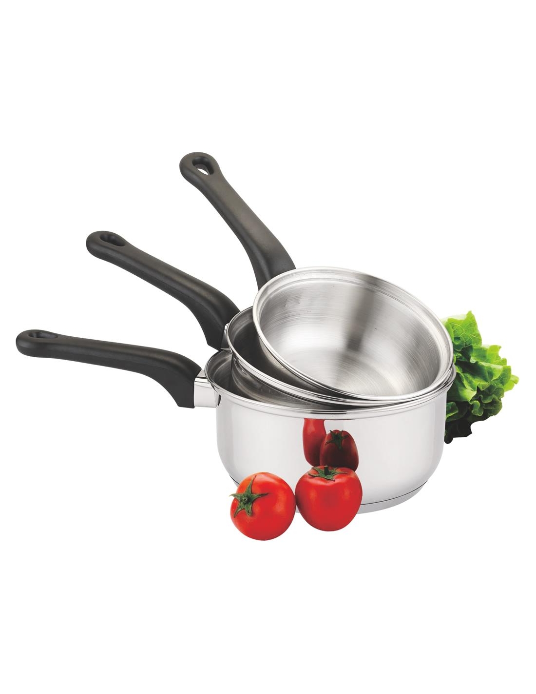 Cet ensemble de 3 casseroles inox est l'équipement de base, robuste et polyvalent, indispensable pour les cuisines locatives ou professionnelles.