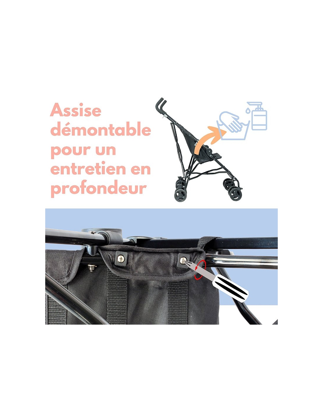 Poussette canne avec canopy pour bébé de 6 à 36 mois à emmener partout grâce à son pliage compact et son poids plume. Grand confort d'utilisation grâce aux suspensions sur les 4 roues.