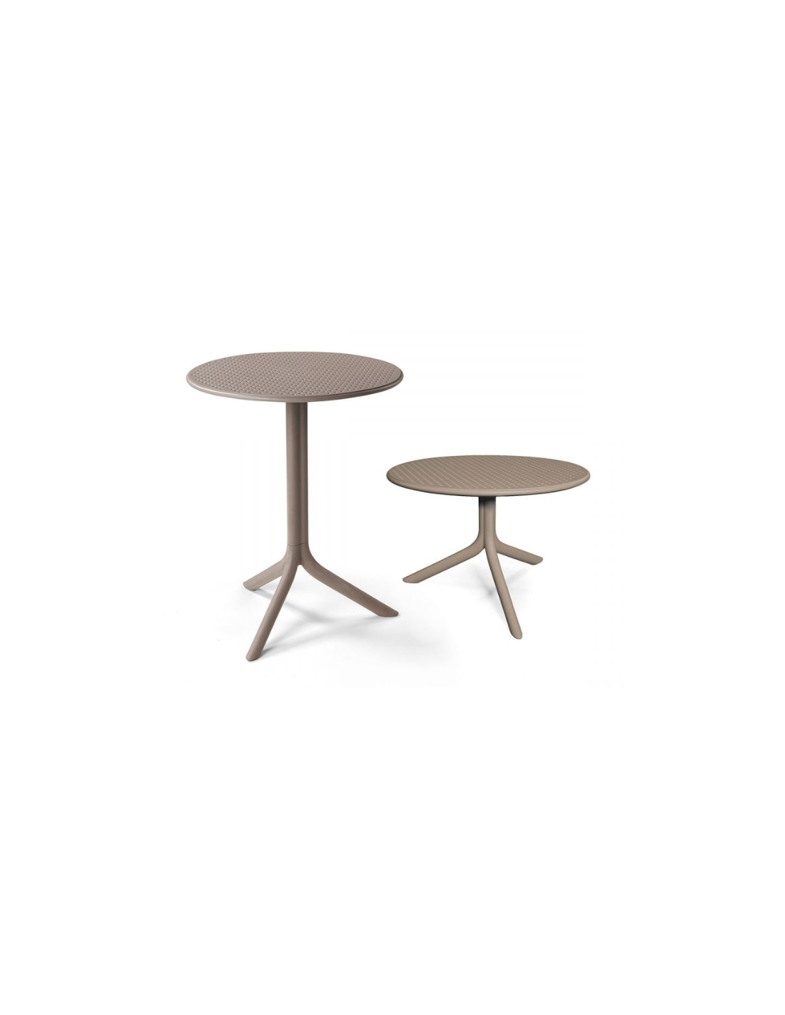 Table avec pied central à 3 branches. Matériau: polypropylène fiberglass traité anti-UV et coloré dans la masse. Démontable.