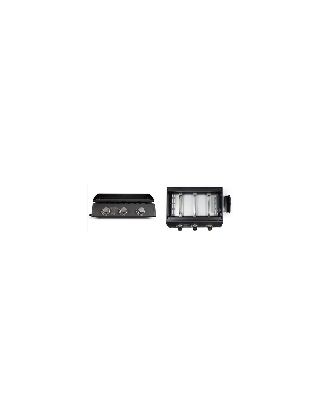 Plancha gaz, convient pour 10 à 12 personnes, Plaque de cuisson 61 x 38 cm en fonte émaillée, 3 brûleurs inox 7500 W, Caisson acier noir, Gaz butane et propane, Récupérateur de graisse,