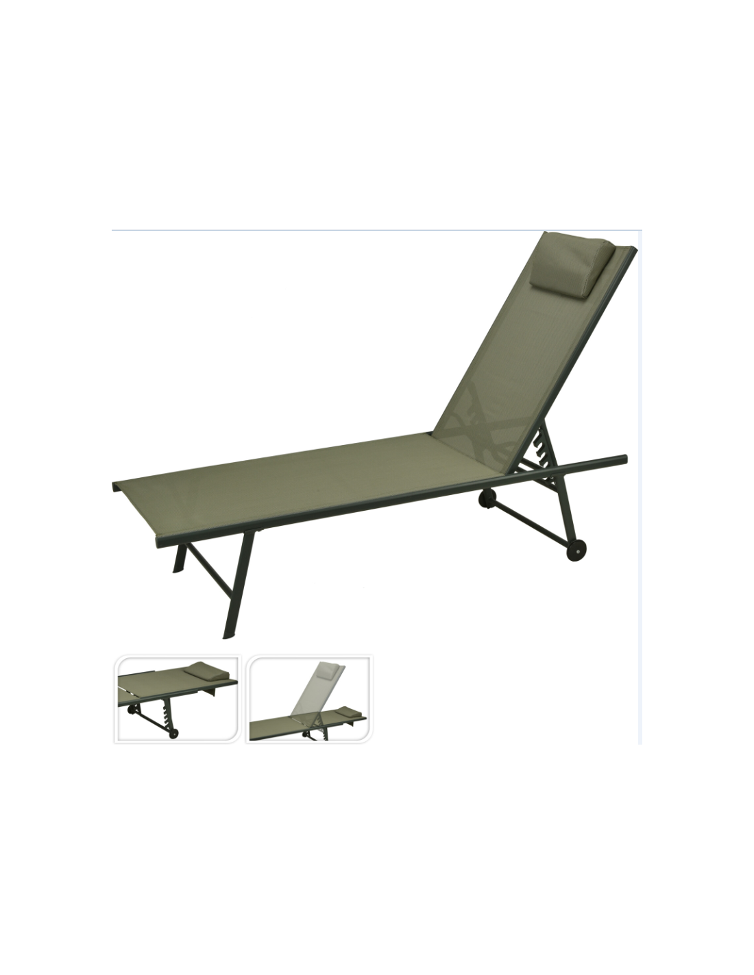 BAIN DE SOLEIL AVEC OREILLER - KAKI 5 POSITIONS, AVEC APPUI TETE ET ROULETTES. CADRE EN ACIER DE COULEUR ANTHRACITE, TUBES DE 30X20MM ET DIA 19MM, AVEC 2 X 1 TISSU 100% POLYESTER TISSÉ DE COULEUR VERT. DIMENSIONS : L185XW55XH32CM