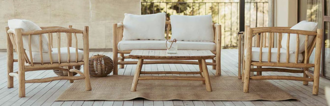SALON JAVA TECK 1 BANQUETTE 2 PL. 2 FAUTEUILS 1 TABLE AVEC COUSSIN BEIGE