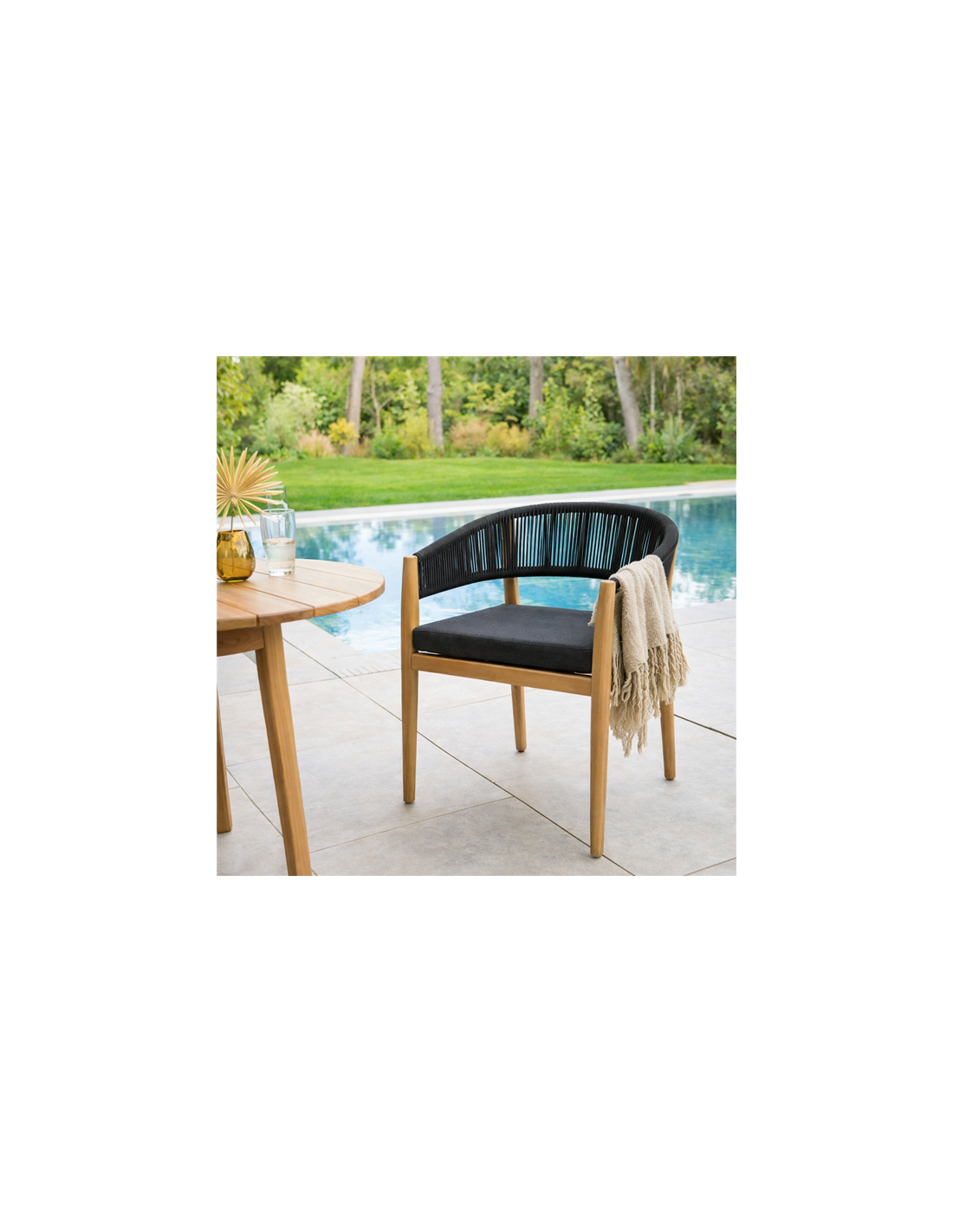 Bois FSC, protégé par un vernis ou une huile. Tissu traité déperlant permettant à l'eau de glisser sans pénétrer dans la matière. Produit traité contre la décoloration. Grâce à des attaches ou à l'antidérapant les coussins ne glissent pas de l'assise Coussins déhoussables pour permettre un nettoyage facile.