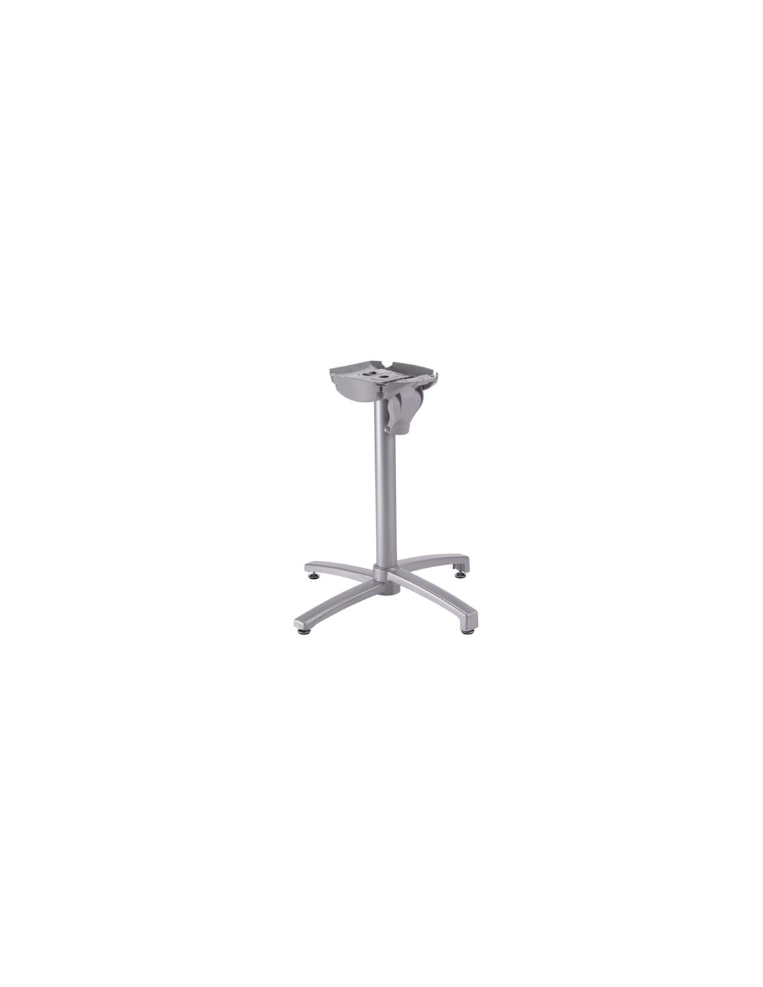 Le tube central possède un système de double indexation évitant les mouvements de rotation du plateau et garantissant le même alignement des plateaux sur chaque pieds d'une terrasse. La base est équipée de 4 tampons en aluminium et acier inoxydable, réglables en hauteur.