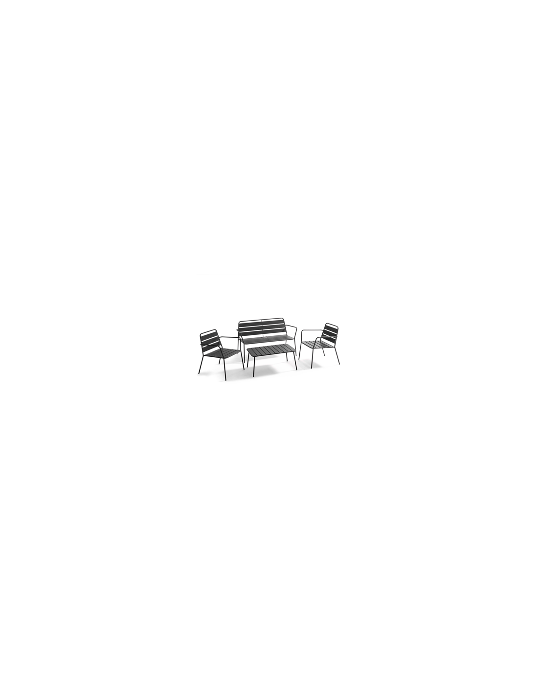 Salon de jardin en métal pour 4 personnes Détails : 2 FAUTEUILS / 1 CANAPÉ / 1 TABLE BASSE (90X50) - MÉTAL GRIS Structure en acier avec finition peinture époxy - Traité anticorrosion