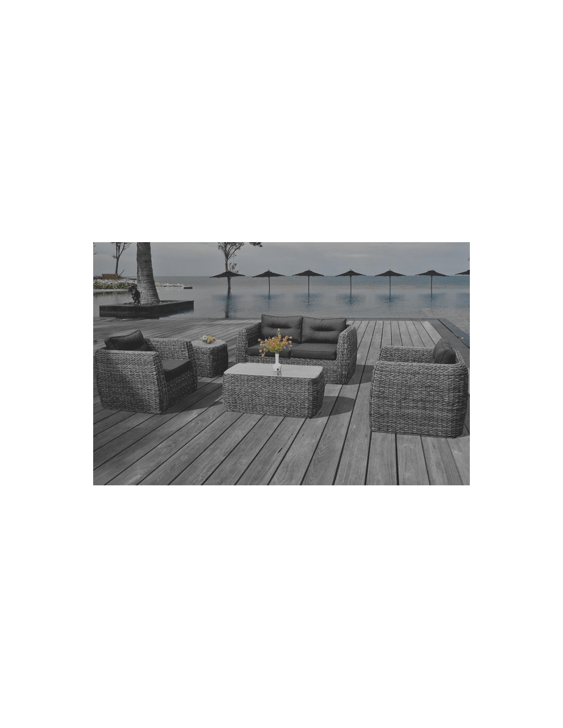 Dimensions : Table : 100 x 60 cm - Plateau de table : 8 mm d'épaisseur - Canapé 2 places - 2 fauteuils - Coussins Gris
