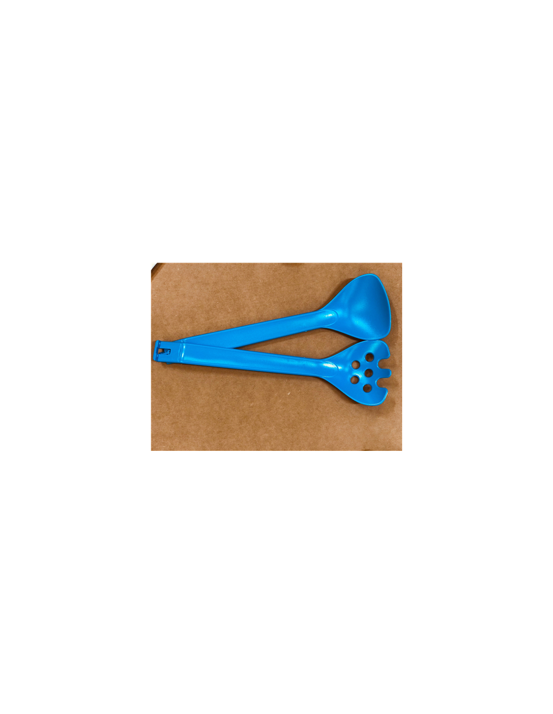 Set de 2 couverts à salade plastique couleur Bleu. Set comprenant une fourchette et une cuillère est plat pour une meilleure récupération de la sauce et les encoches au bout du manche permettent de lier les ustensiles pour devenir une pince.