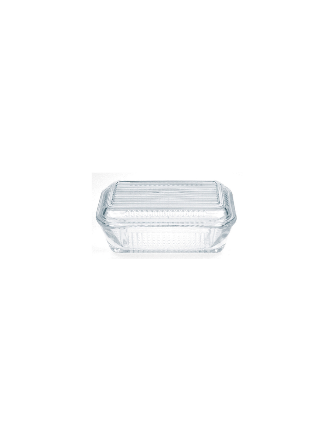 Beurrier + couvercle Fabrication : Fabriqué en France, ce beurrier est en verre, un matériau sain, non poreux et durable pour l'environnement. Dimension: 17 x 9.5 cm Matière : verre trempé